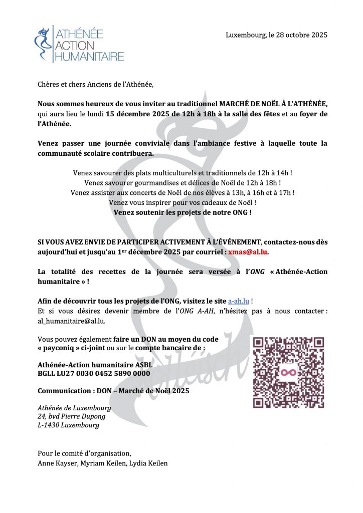 C’est uniquement à travers vos contributions que l’Association des Anciens de l’Athénée parviendra à durablement soutenir ces précieuses initiatives.